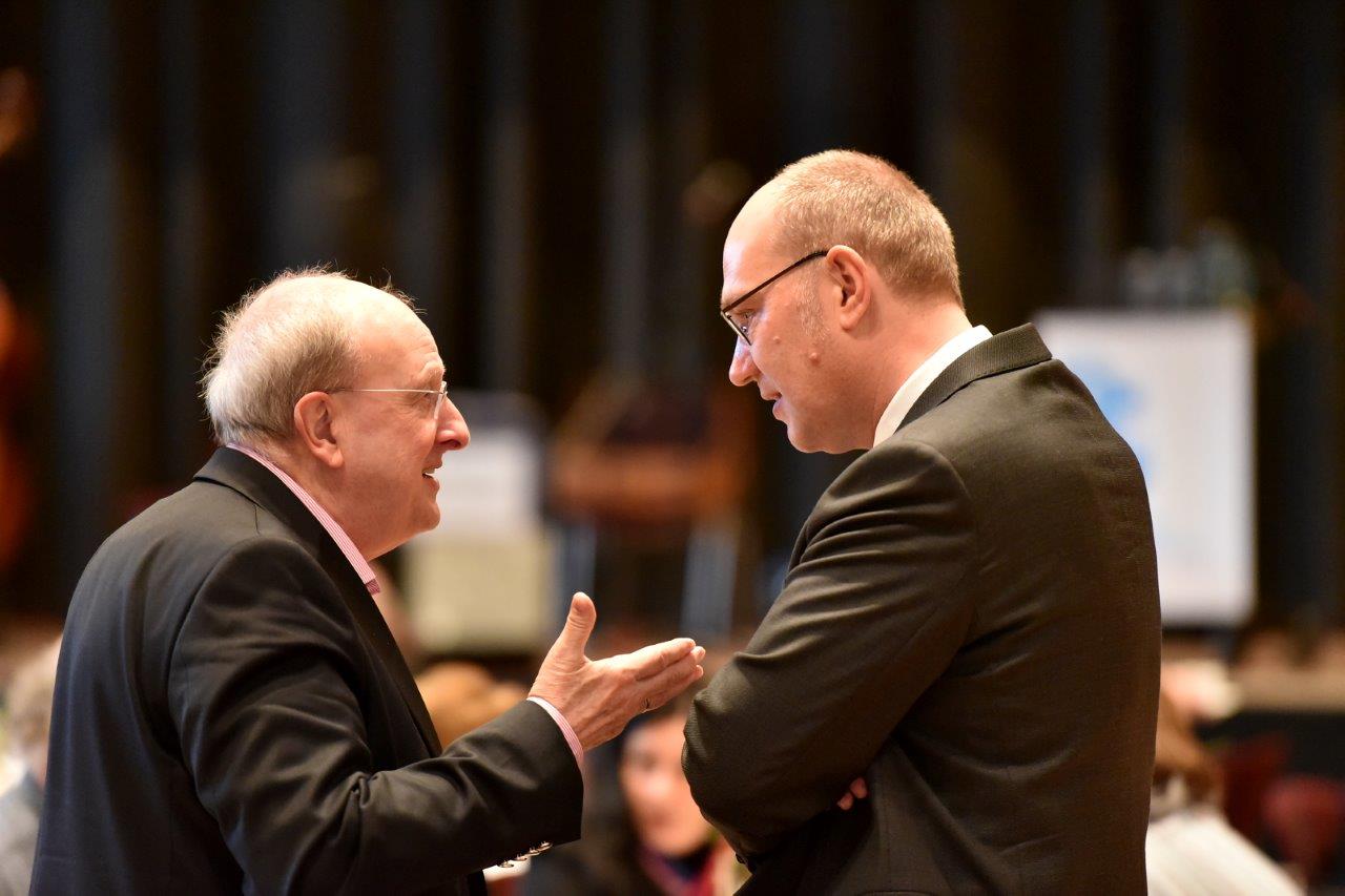 Pfarrer Rüdiger Schuch, Vorstandsvorsitzender der Evangelischen Perthes-Stiftung e. V., begrüßte anschließend die geladenen Gäste in der Kamener Stadthalle und thematisierte die Veränderungsprozesse der Gesellschaft, die sich auch in der Arbeit in den Einrichtungen vor Ort zeigten und eine Herausforderung darstellten. Die Diskussion darüber, „was es braucht, um in einer zunehmend pluralen Gesellschaft in Deutschland Denk- und Handlungsmuster zu entwickeln, die ein menschengerechtes, lebenswertes Leben ermöglichen“ sei auch für die Arbeit christlicher Träger wichtig.